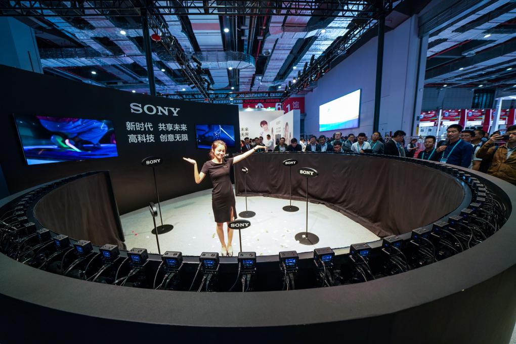 2018年11月6日,一名體驗(yàn)者在首屆進(jìn)博會(huì)索尼公司展臺(tái)體驗(yàn)“子彈時(shí)間”拍攝。新華社記者 王建華 攝