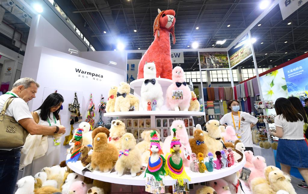 2021年5月7日,在海南??谂e行的首屆中國國際消費(fèi)品博覽會(huì)(簡稱“消博會(huì)”)上,人們在秘魯“溫暖駝”展位參觀。