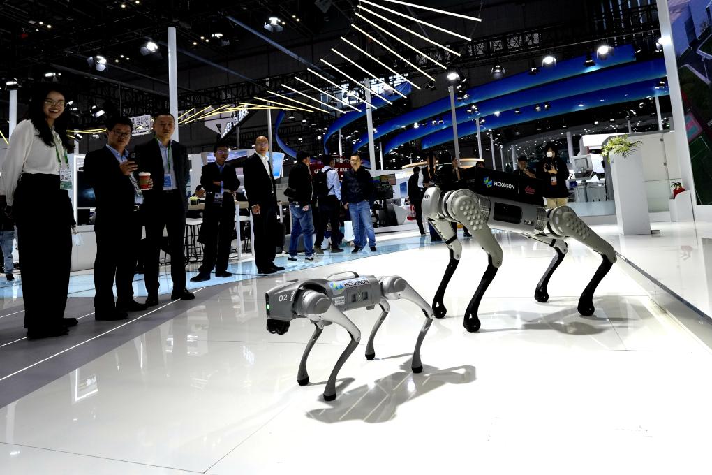 2023年11月7日,觀眾在第六屆進(jìn)博會(huì)技術(shù)裝備展區(qū)觀看智能機(jī)器狗。新華社記者 張建松 攝