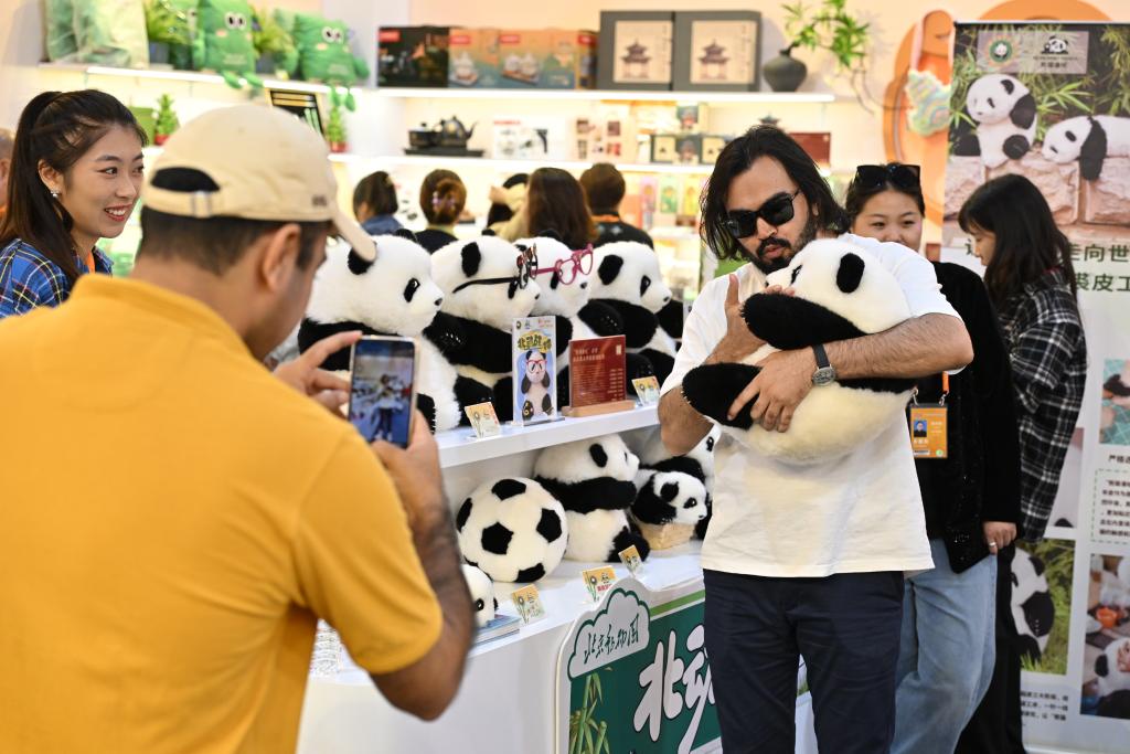 2024年9月16日,國外參觀者在服貿(mào)會(huì)首鋼園區(qū)文旅服務(wù)專題展區(qū)抱著北京動(dòng)物園推出的大熊貓文創(chuàng)玩偶合影。新華社記者 李鑫 攝