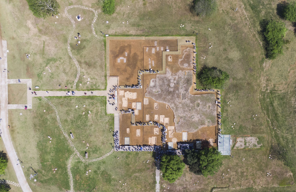 這是2024年4月18日拍攝的位于安徽省馬鞍山市含山縣境內(nèi)的凌家灘國家考古遺址公園墓葬祭祀?yún)^(qū)(無人機(jī)照片)。新華社記者 傅天 攝