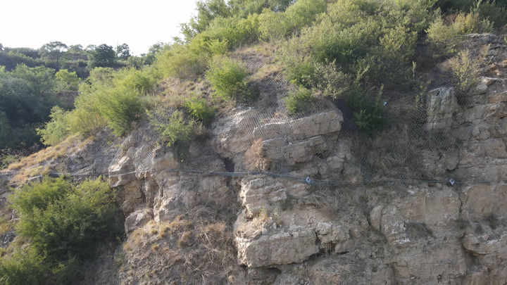 為防止碎石脫落將古棧道掩埋或毀壞,近幾年國家出資對(duì)此處棧道上的危巖體進(jìn)行加固。目前工程已竣工,古棧道上方有專業(yè)防護(hù)網(wǎng),新修的排水溝阻斷了上方雨水對(duì)古棧道的沖刷。