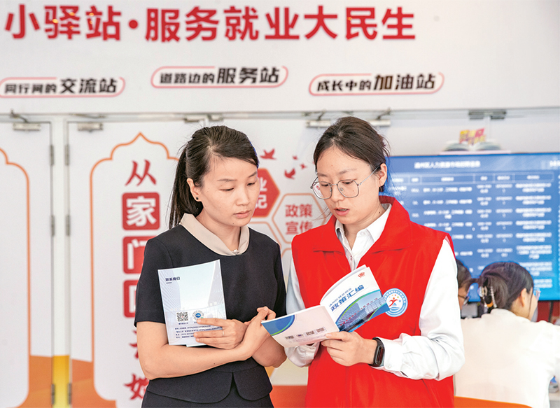 零工市場(chǎng)是向靈活就業(yè)人員與用工主體提供就業(yè)服務(wù)的重要載體。圖為2024年9月3日,江蘇省南通市通州區(qū)萬(wàn)達(dá)廣場(chǎng)“零工驛站”內(nèi),就業(yè)服務(wù)人員在向求職者介紹就業(yè)創(chuàng)業(yè)政策。人民圖片 翟慧勇/攝