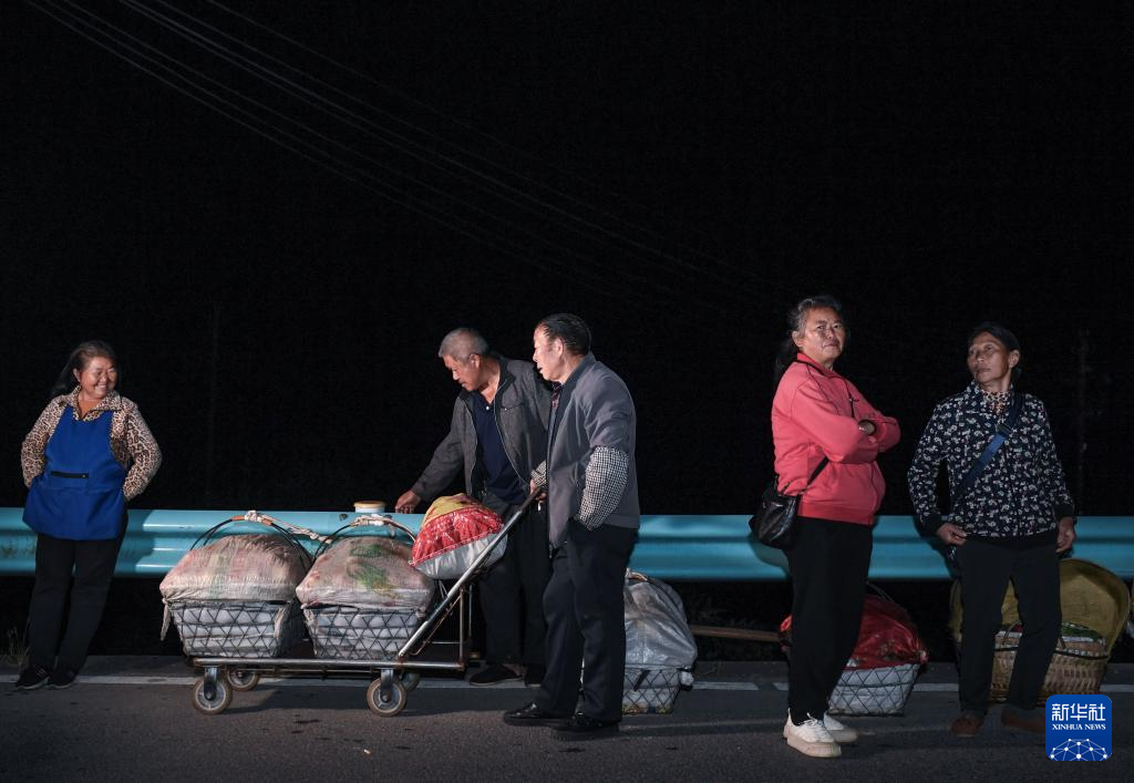 村民在貴陽市烏當(dāng)區(qū)水田鎮(zhèn)定扒村候車,準(zhǔn)備乘坐252路“惠農(nóng)專線”公交車進(jìn)城賣菜(11月7日攝)。