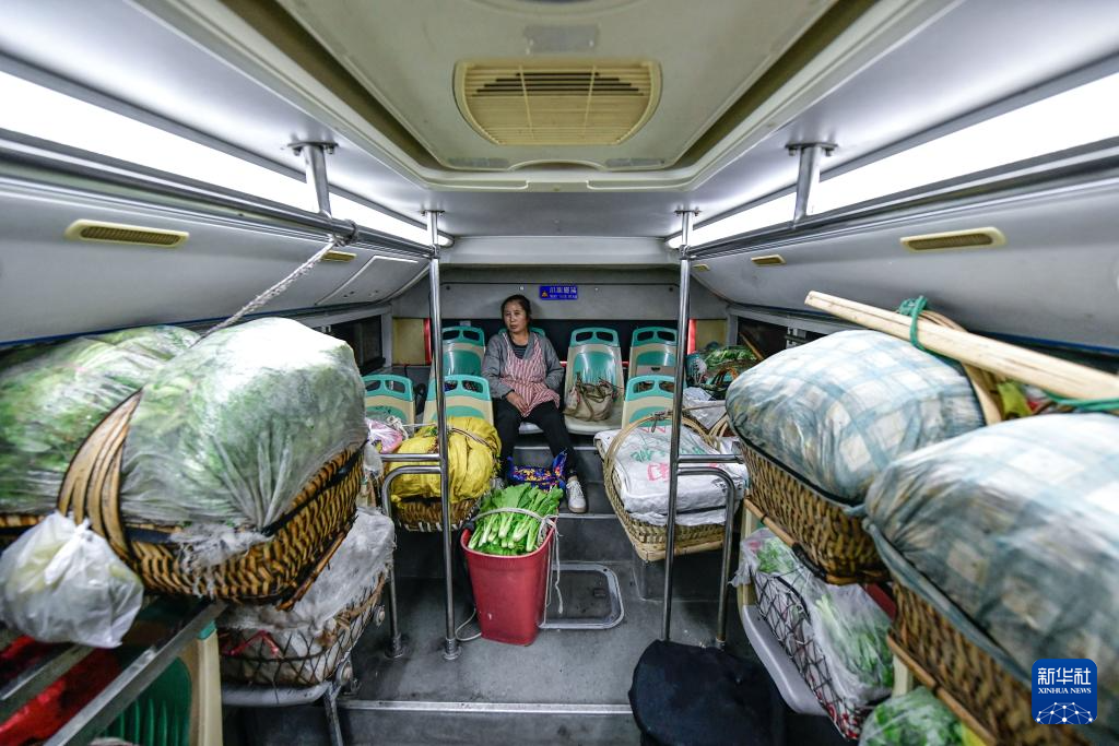 在貴陽市烏當(dāng)區(qū)水田鎮(zhèn)定扒村,菜農(nóng)乘坐252路“惠農(nóng)專線”公交車,準(zhǔn)備進(jìn)城賣菜(11月7日攝)。