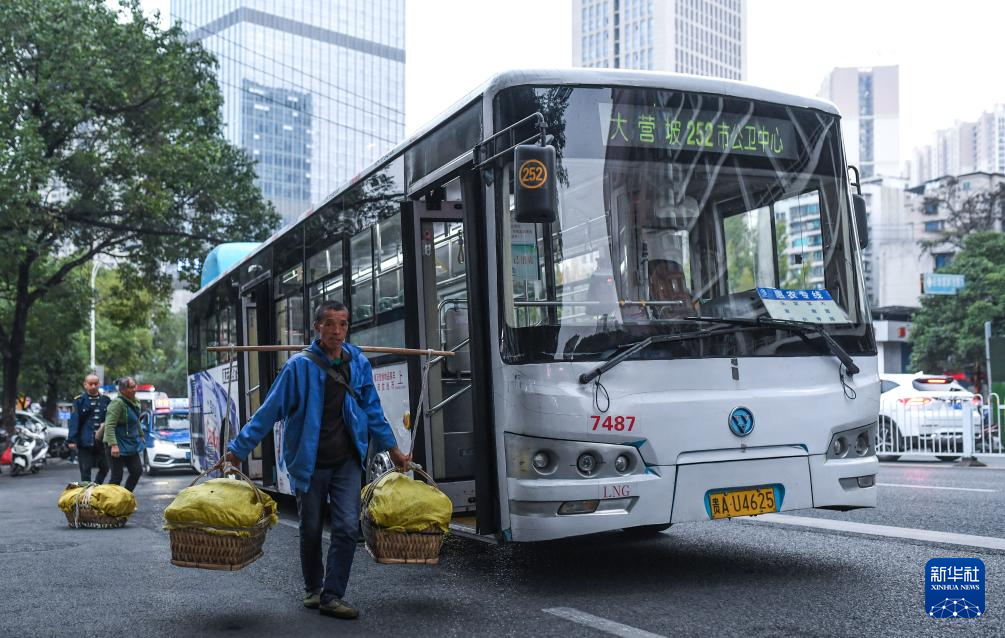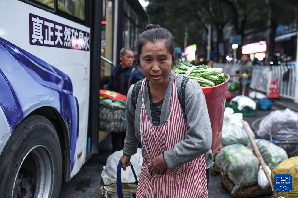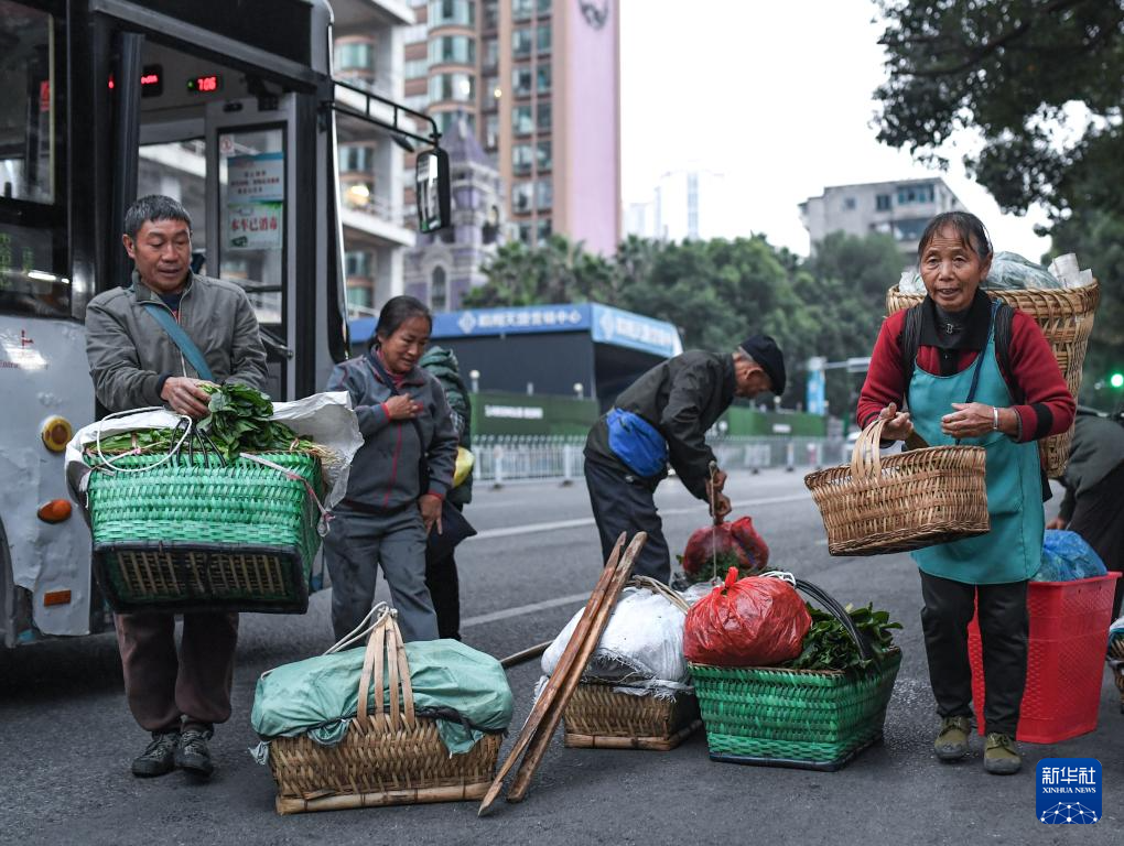 菜農(nóng)乘坐252路“惠農(nóng)專線”公交車抵達(dá)貴陽市大營坡終點(diǎn)站,準(zhǔn)備將蔬菜就近售賣(11月7日攝)。