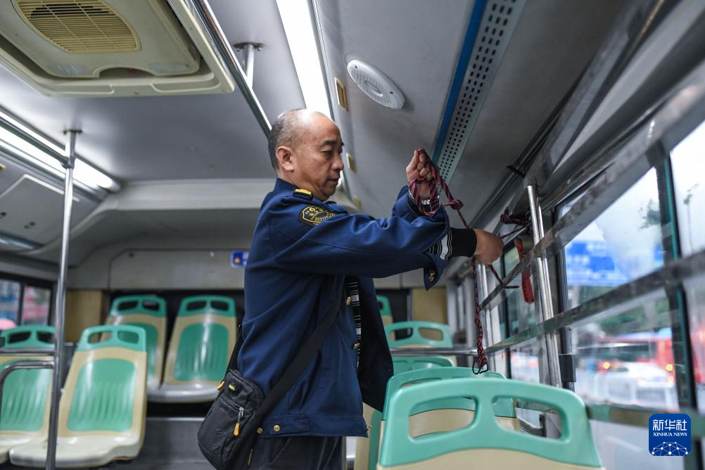 司機(jī)張桂林在252路“惠農(nóng)專線”公交車抵達(dá)貴陽市大營坡終點(diǎn)站后整理置物架(11月7日攝)。