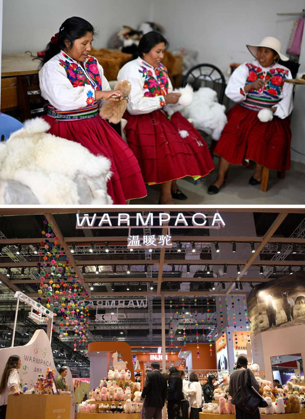 2016年,中國(guó)姑娘馬玉霞在秘魯阿雷基帕街邊市場(chǎng)購(gòu)買(mǎi)了秘魯羊駝毛制品手工藝人奧斯瓦爾多·馬馬尼的羊駝毛玩偶并引入中國(guó)市場(chǎng)。通過(guò)連續(xù)參展進(jìn)博會(huì),羊駝毛制品在中國(guó)市場(chǎng)大受歡迎,并創(chuàng)立了中文品牌“溫暖駝”。今年,秘魯品牌“溫暖駝”連續(xù)第七年亮相進(jìn)博會(huì),受到更多中國(guó)消費(fèi)者的喜愛(ài)。目前,“溫暖駝”品牌已入駐國(guó)內(nèi)30多家商場(chǎng),并且開(kāi)拓了電商平臺(tái)線(xiàn)上銷(xiāo)售,年銷(xiāo)量超過(guò)3萬(wàn)只。上圖:2024年6月20日,在秘魯阿雷基帕,工作人員在羊駝毛制品手工藝人奧斯瓦爾多·馬馬尼的工坊制作羊駝玩偶。下圖:2024年11月5日在上海拍攝的第七屆進(jìn)博會(huì)秘魯“溫暖駝”展臺(tái)。