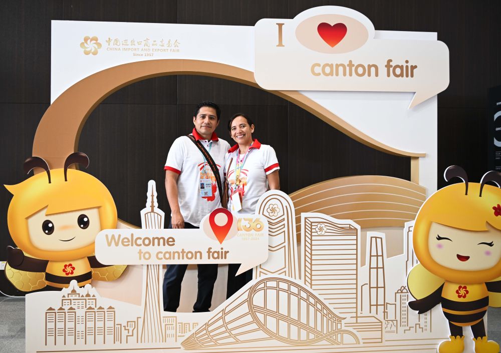2024年10月15日,來(lái)自秘魯?shù)牟少?gòu)商在廣州舉行的廣交會(huì)上合影留念。