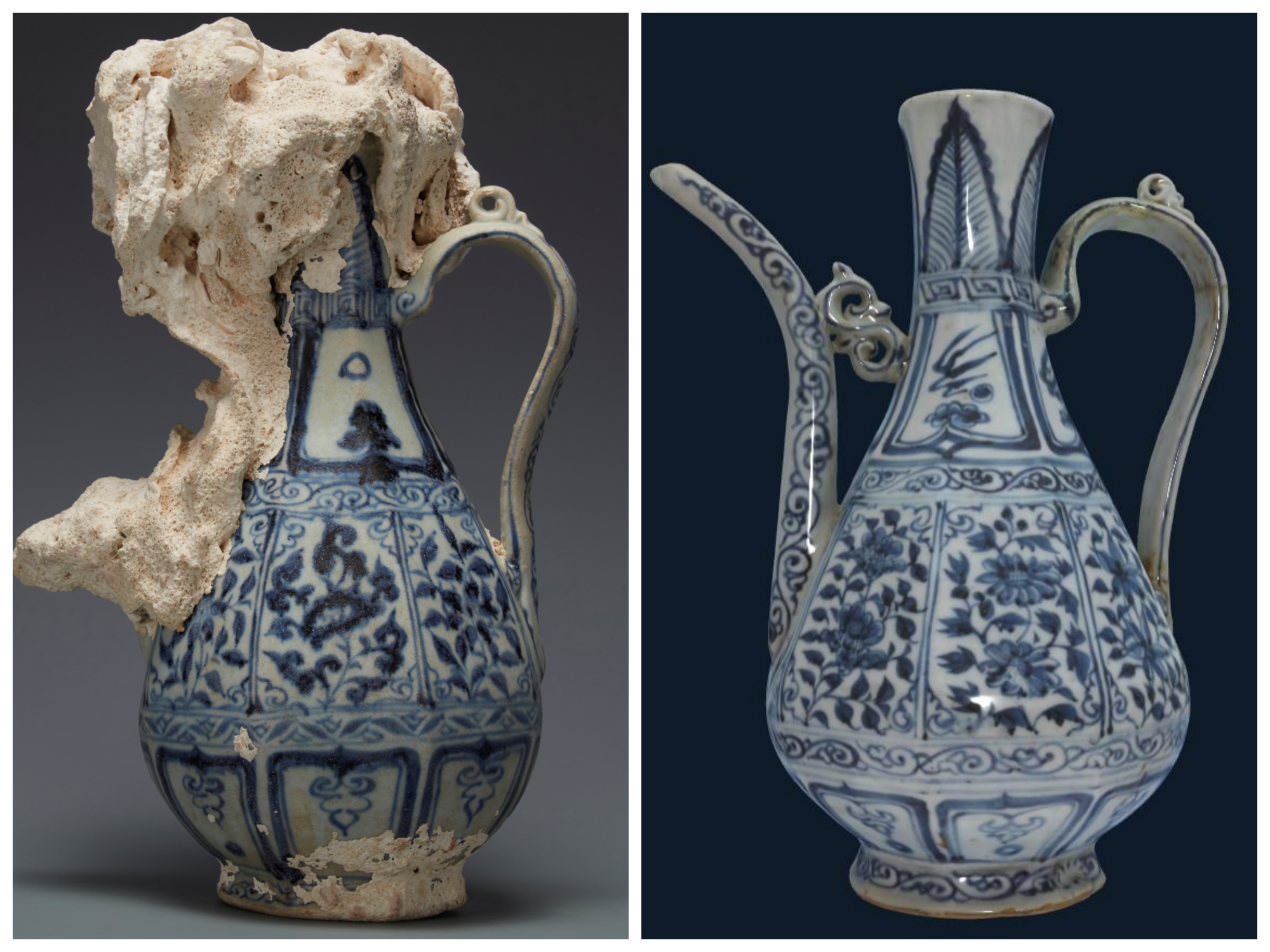 △中國(海南)南海博物館藏元青花花卉紋八棱執(zhí)壺(左)與河北博物院藏青花八棱執(zhí)壺對比。