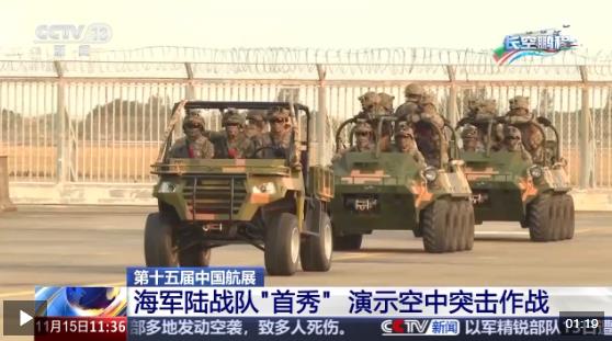 第十五屆中國航展是海軍陸戰(zhàn)隊員首次參加,除了演示艦載直升機飛行課目,還有搭載全地形山貓突擊車及多名陸戰(zhàn)隊員進行快速突擊,奪控敵目標的課目。