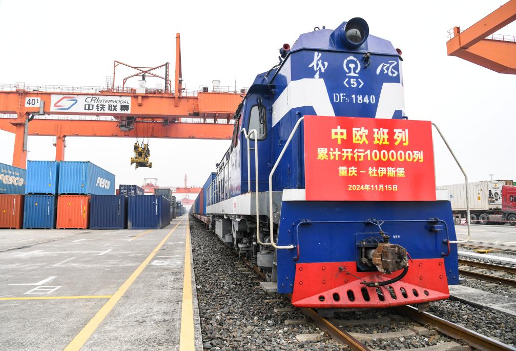 11月15日,第10萬列中歐班列——X8083次中歐班列(重慶—杜伊斯堡)在重慶團(tuán)結(jié)村中心站準(zhǔn)備發(fā)車。新華社記者 王全超 攝