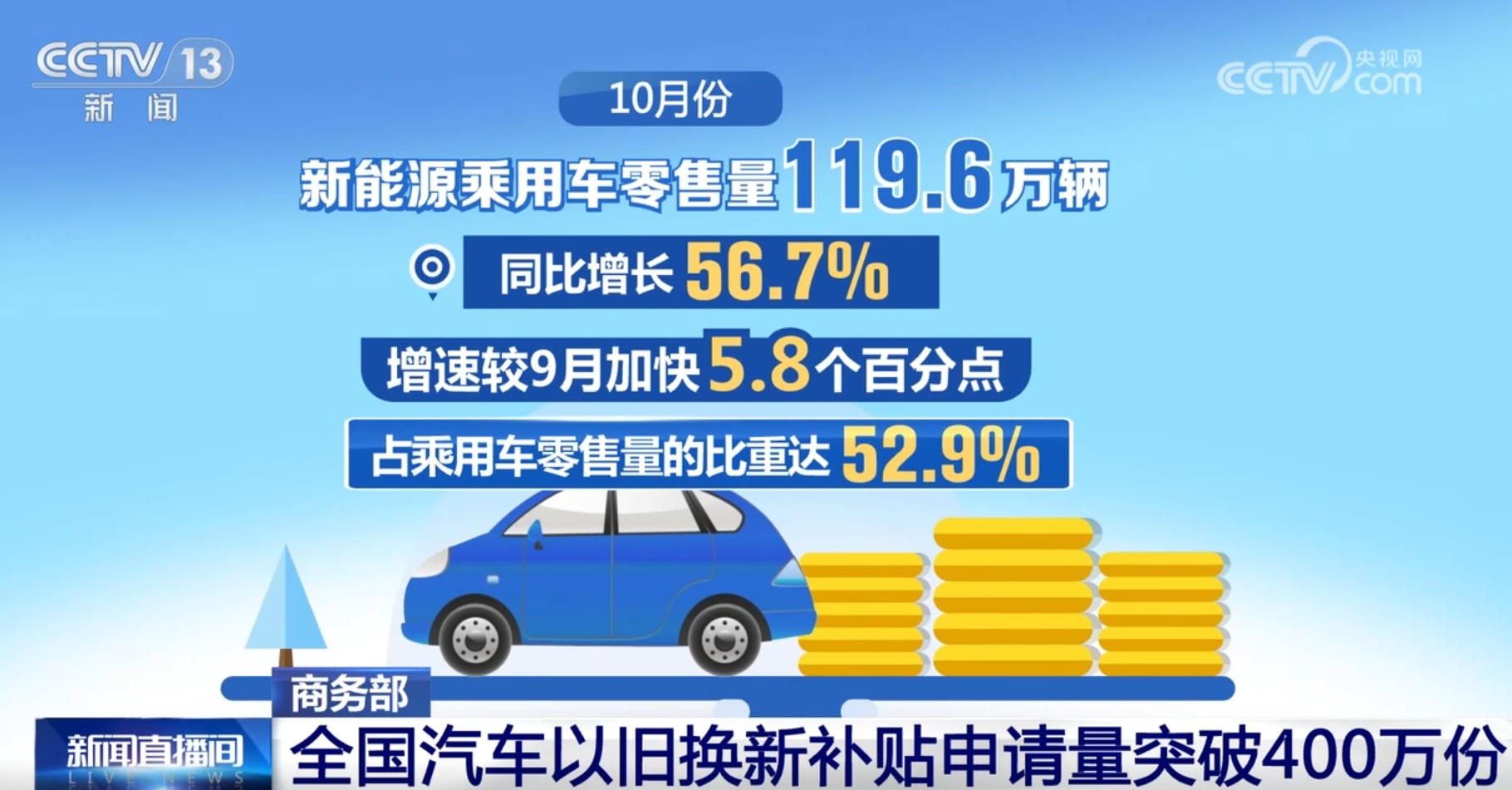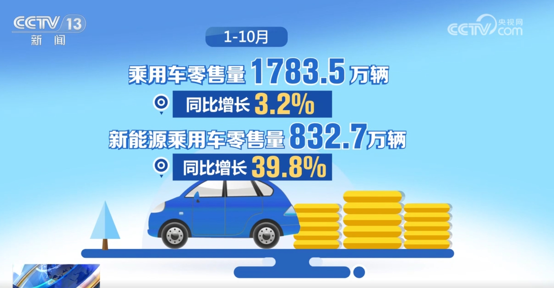 在以舊換新政策的帶動(dòng)下,汽車(chē)銷(xiāo)量也有了明顯增長(zhǎng)。10月份,乘用車(chē)零售量226.1萬(wàn)輛,同比增長(zhǎng)11.3%,增速較9月加快6.8個(gè)百分點(diǎn)。其中,新能源乘用車(chē)零售量119.6萬(wàn)輛,同比增長(zhǎng)56.7%,增速較9月加快5.8個(gè)百分點(diǎn),占乘用車(chē)零售量的比重達(dá)52.9%。1—10月,乘用車(chē)零售量1783.5萬(wàn)輛,同比增長(zhǎng)3.2%。其中,新能源乘用車(chē)零售量832.7萬(wàn)輛,同比增長(zhǎng)39.8%。