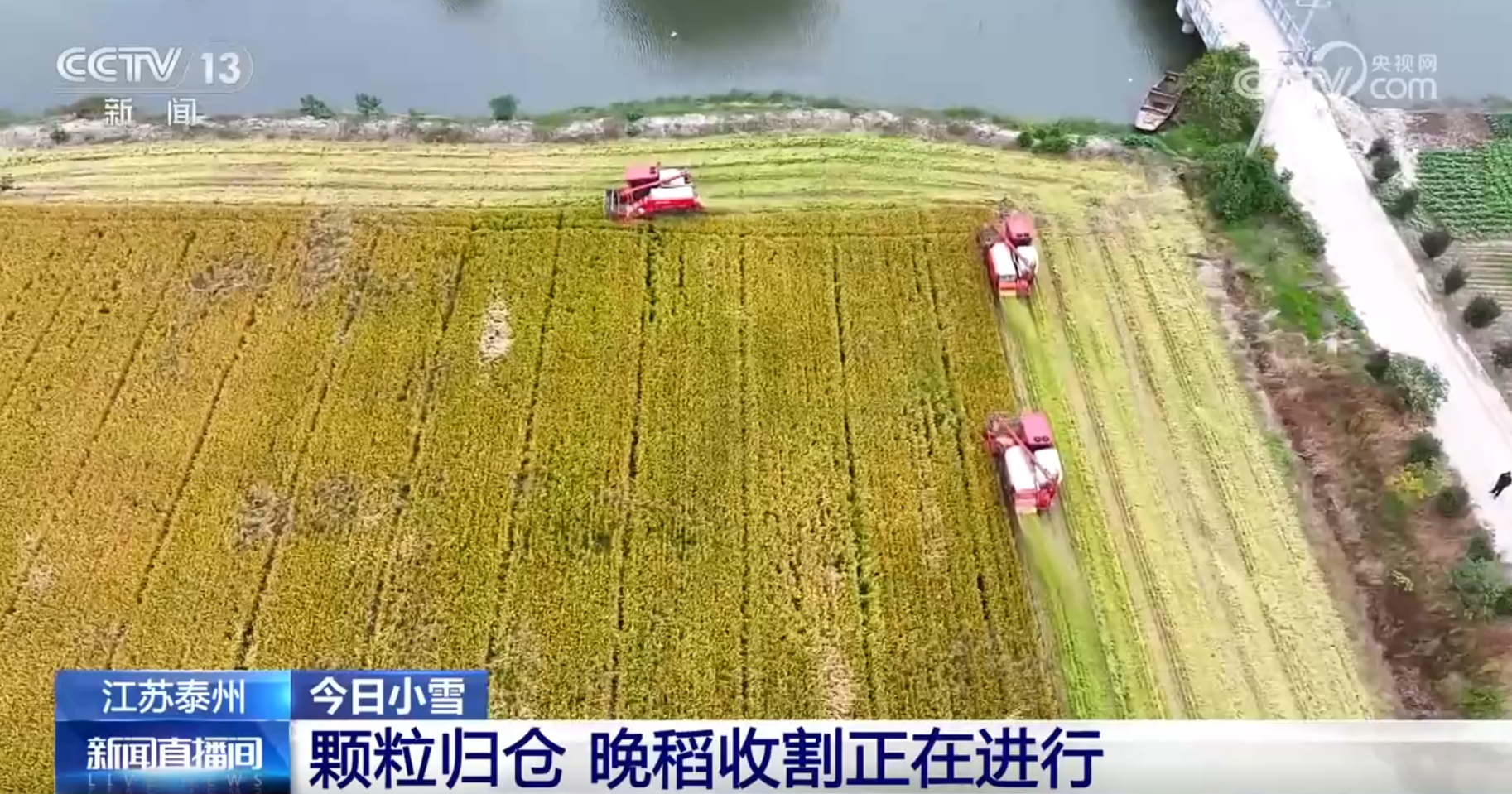 我們現(xiàn)在看到的是江蘇泰州正在進(jìn)行的晚稻收割作業(yè)。這個(gè)時(shí)候,當(dāng)?shù)卦绲竞椭械疽呀?jīng)收獲完成,收割機(jī)正開(kāi)足馬力進(jìn)行晚稻收獲,割穗、脫粒、粉碎秸稈,一氣呵成,連倒伏的稻穗也被采收干凈,金黃飽滿(mǎn)的稻谷順著管道傾瀉而下,顆粒歸倉(cāng)。