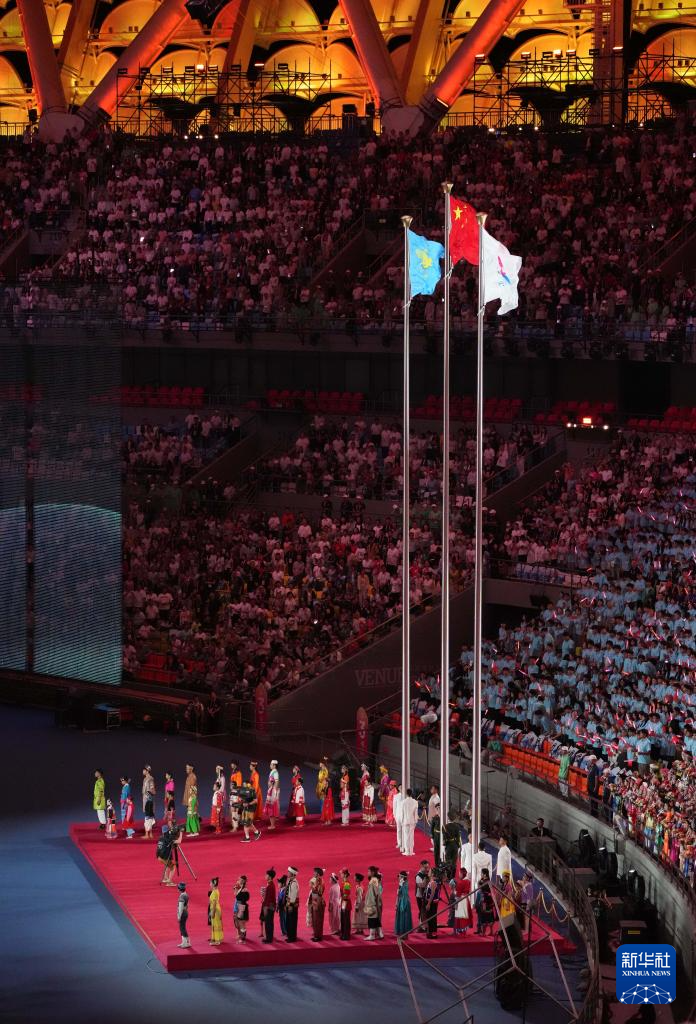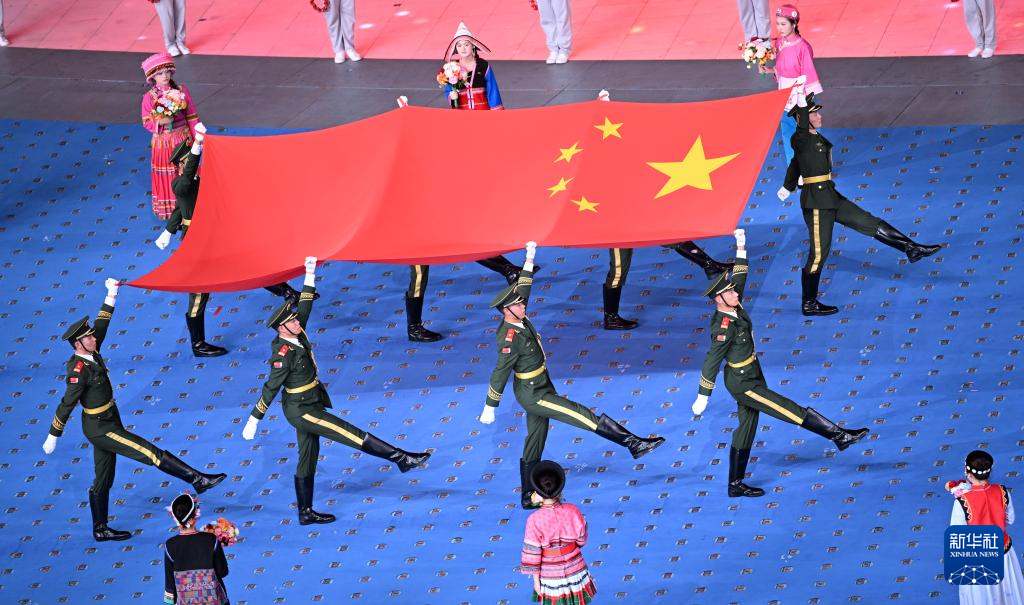 11月22日,中華人民共和國(guó)國(guó)旗、中華人民共和國(guó)少數(shù)民族傳統(tǒng)體育運(yùn)動(dòng)會(huì)會(huì)旗和中華人民共和國(guó)第十二屆少數(shù)民族傳統(tǒng)體育運(yùn)動(dòng)會(huì)會(huì)旗在開(kāi)幕式上飄揚(yáng)。