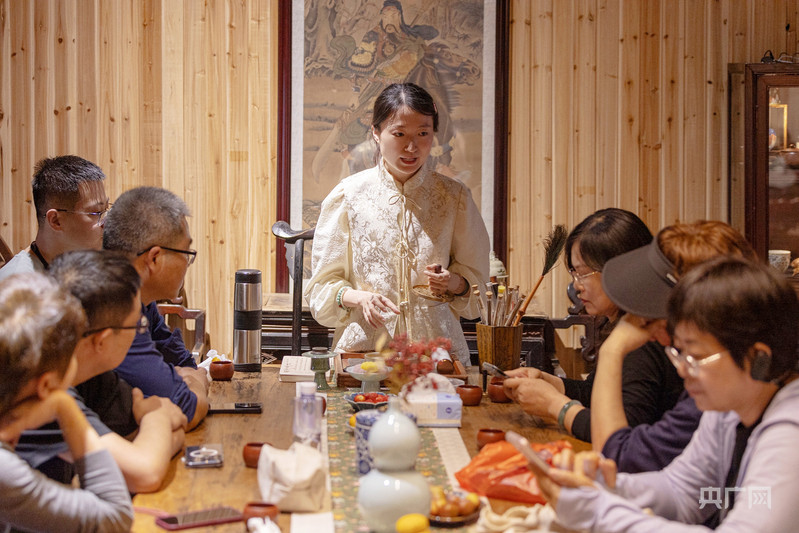 在倒扒獅街,“90后”安慶姑娘秦無顏是一家文化主題會館的主理人。在她的會館里,檀木、玉石等制作而成的新中式文玩飾品、傳統(tǒng)工藝面料制作而成的“新中式”服裝、古色古香的“新中式”茶館,定期舉行的雅集活動……無一不體現(xiàn)著獨特的東方美學。2020年,在上海從事珠寶設(shè)計工作的她返回家鄉(xiāng)經(jīng)營起這家文化空間?!凹戎鹦?,也尋根?!彼M?,客人來到這里,放慢腳步,在交流與體驗中感受傳統(tǒng)文化的魅力,豐富精神體驗。