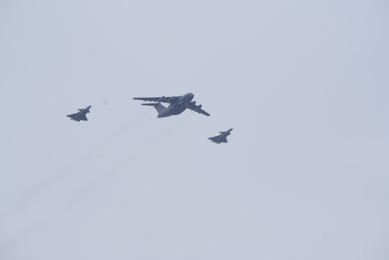 2023年,第十批在韓中國(guó)人民志愿軍烈士遺骸回國(guó),“運(yùn)-20”和兩架護(hù)航飛機(jī)“殲-20”。人民網(wǎng)記者 邱宇哲攝