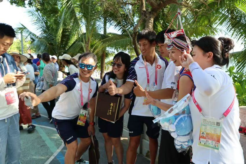 在運(yùn)動(dòng)會(huì)毽球場館,每支參賽隊(duì)伍都收到了香港代表團(tuán)贈(zèng)送的毽球掛飾或龍形胸針。西藏代表團(tuán)的壯族小伙韋盛森計(jì)劃回贈(zèng)具有壯族特色的“繡球”;而早就與香港運(yùn)動(dòng)員因毽球結(jié)緣的廣東隊(duì)老將孫麗艷則決定——等香港隊(duì)在圣誕節(jié)到廣東集訓(xùn)時(shí),她要給老朋友回贈(zèng)實(shí)用的禮物。