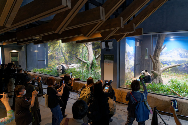 2024年9月28日,參觀者在日本東京上野動(dòng)物園拍攝留念,告別大熊貓“比力”(左)和“仙女”(右)。新華社記者張笑宇 攝