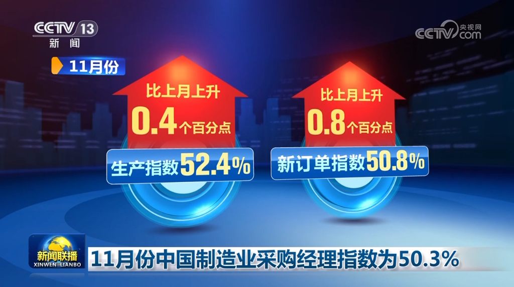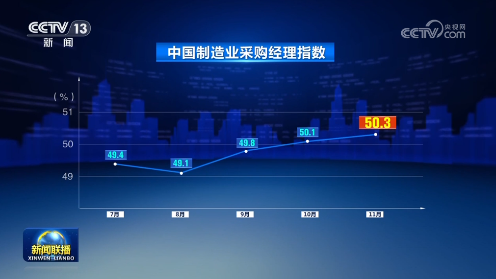 中國物流與采購聯(lián)合會、國家統(tǒng)計(jì)局11月30日公布11月份中國制造業(yè)采購經(jīng)理指數(shù)。隨著一系列存量政策和增量政策持續(xù)協(xié)同發(fā)力,制造業(yè)采購經(jīng)理指數(shù)擴(kuò)張步伐有所加快,我國經(jīng)濟(jì)景氣水平總體保持穩(wěn)定擴(kuò)張。