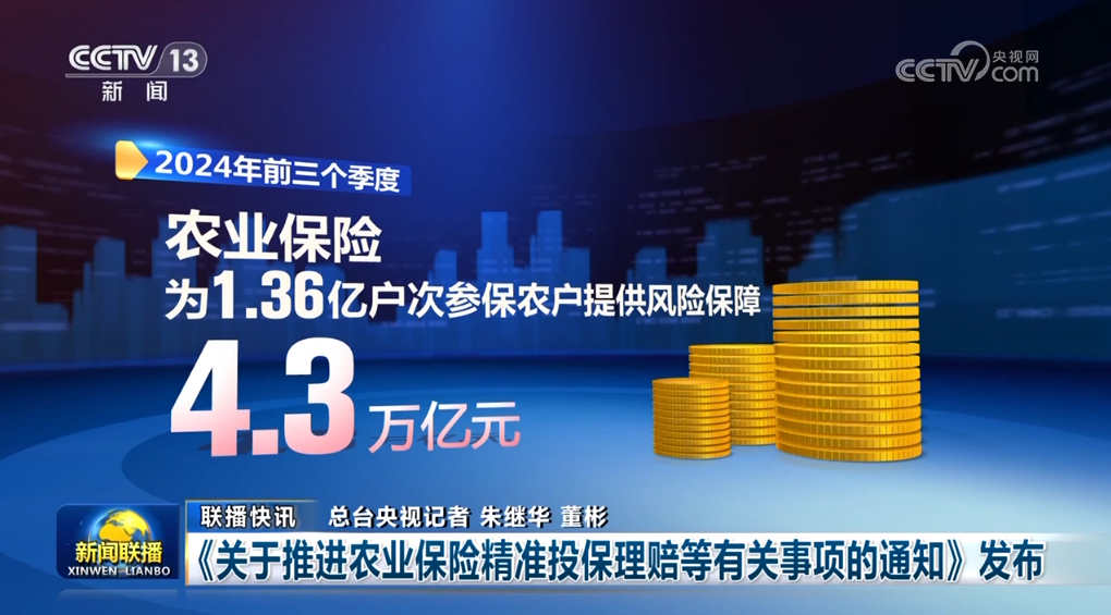 金融監(jiān)管總局等四部門近日聯(lián)合發(fā)布通知,對農(nóng)業(yè)保險(xiǎn)投保理賠、應(yīng)收保費(fèi)、條款費(fèi)率、數(shù)據(jù)共享等提出要求,進(jìn)一步提高投保理賠精準(zhǔn)性,推動我國農(nóng)業(yè)保險(xiǎn)高質(zhì)量發(fā)展。今年前三個季度,農(nóng)業(yè)保險(xiǎn)為1.36億戶次參保農(nóng)戶提供風(fēng)險(xiǎn)保障4.3萬億元。