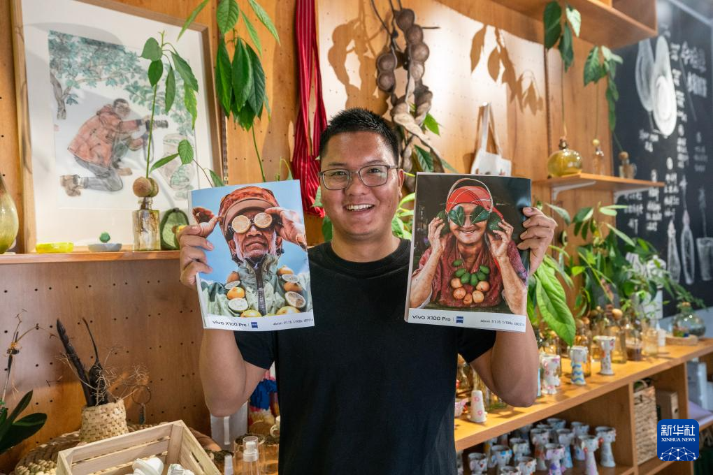 孟連縣“新農(nóng)人”、“牛友果星球”工作室主人李偉展示自己拍攝的創(chuàng)意照片(10月28日攝)。新華社記者 陳欣波 攝