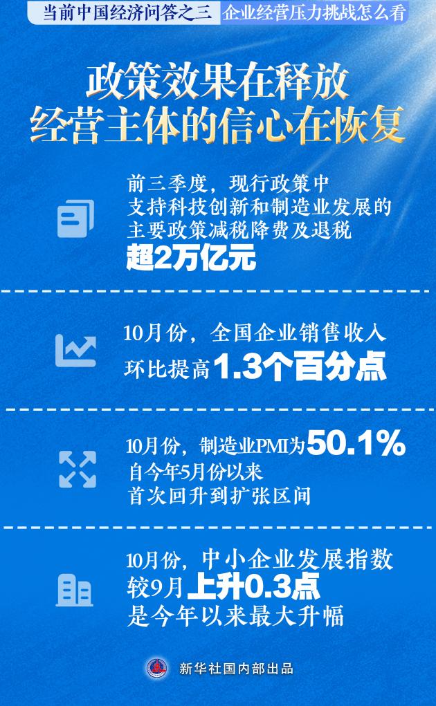 10月份,全國(guó)企業(yè)銷售收入同比增長(zhǎng),環(huán)比提高1.3個(gè)百分點(diǎn);制造業(yè)PMI為50.1%,自今年5月份以來首次回升到擴(kuò)張區(qū)間;非制造業(yè)商務(wù)活動(dòng)指數(shù)連續(xù)數(shù)月穩(wěn)定在50%左右;中小企業(yè)發(fā)展指數(shù)較9月上升0.3點(diǎn),是今年以來最大升幅。