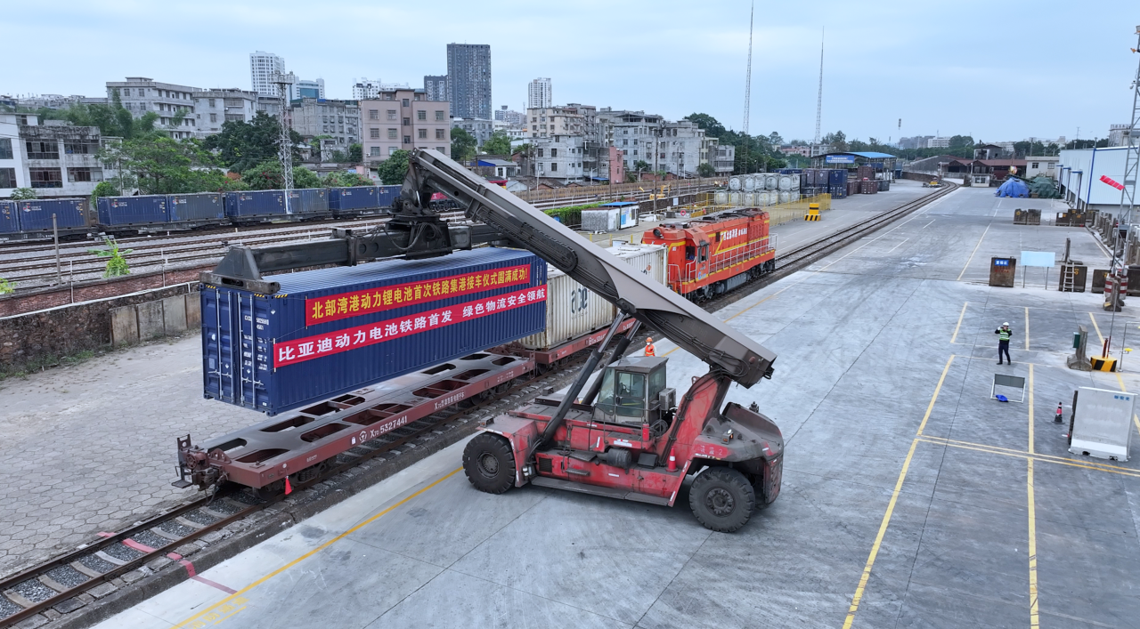 11月19日,一列載著比亞迪新能源動力鋰電池的列車,從重慶長壽區(qū)渝巴專用鐵路發(fā)車,沿著西部陸海新通道南下,于22日駛?cè)霃V西北部灣防城港新宏光鐵路專用線。隨著接卡作業(yè)的完成,全國首次鐵路發(fā)運動力鋰電池在北部灣港順利接卸。