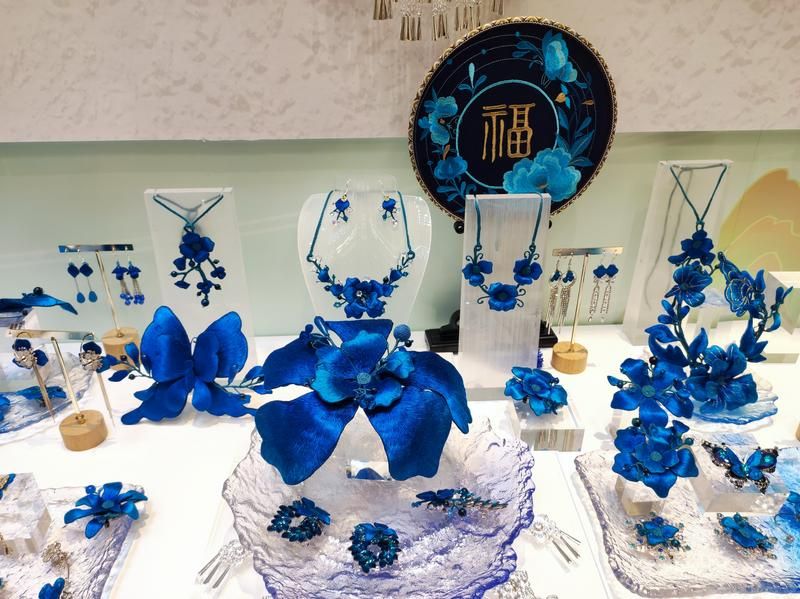 酉州苗繡非遺工坊的“藍(lán)色系列”首飾。中青報·中青網(wǎng)記者 蔣肖斌/攝