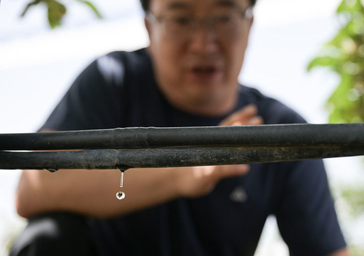 在陜西省延安市洛川縣槐柏鎮(zhèn)度古村“飛天”蘋果基地灌溉示范點,節(jié)水滴灌系統(tǒng)為果樹灌溉(2024年6月23日攝)。