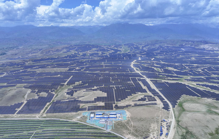 這是2024年6月11日在新疆伊犁哈薩克自治州拍攝的中國綠發(fā)尼勒克縣400萬千瓦風(fēng)電光伏一體化項目(無人機照片)。新華社記者 趙戈 攝