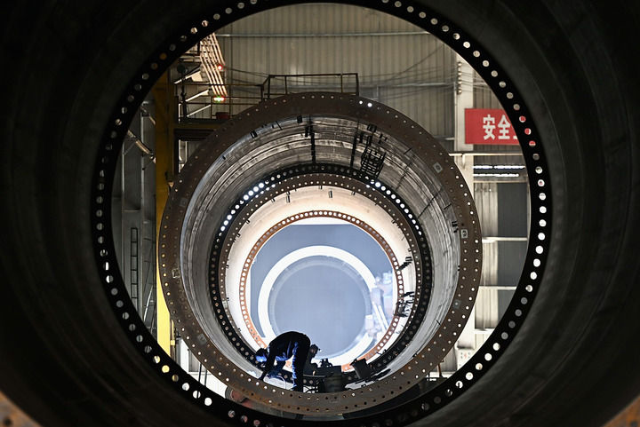 2024年4月23日,新疆木壘哈薩克自治縣民生工業(yè)園區(qū)木壘泰勝風(fēng)能裝備有限公司工人在生產(chǎn)線上生產(chǎn)風(fēng)力發(fā)電機塔筒。新華社記者 王菲 攝