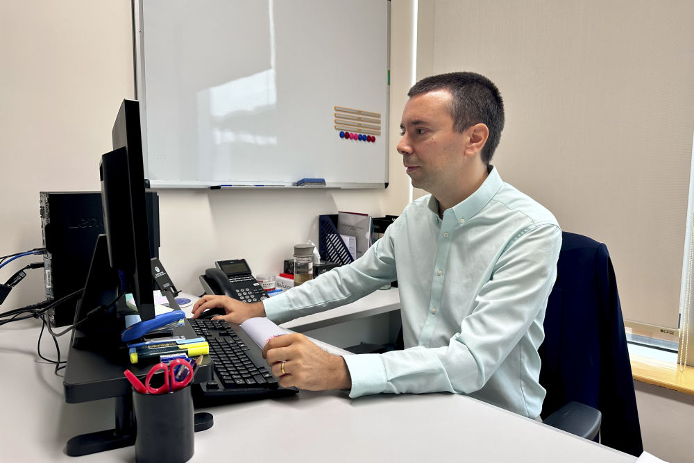2024年11月21日,澳門城市大學(xué)葡語(yǔ)國(guó)家研究院的助理教授、來(lái)自葡萄牙的若昂·西蒙斯(中文名朱奧)在辦工室工作。新華社記者 王露 攝