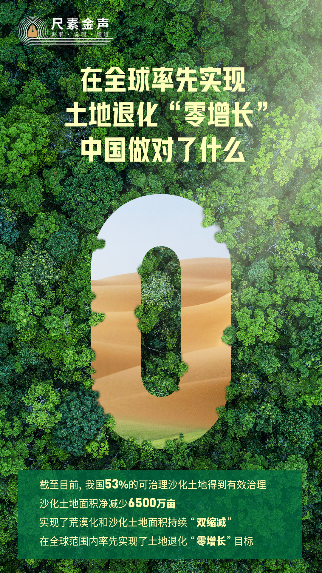 最新數(shù)據(jù)顯示,截至目前,我國53%的可治理沙化土地得到有效治理,沙化土地面積凈減少6500萬畝,實(shí)現(xiàn)了荒漠化和沙化土地面積持續(xù)“雙縮減”,在全球范圍內(nèi)率先實(shí)現(xiàn)了土地退化“零增長”目標(biāo)。