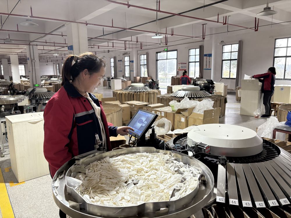 在貴州亞獅龍產(chǎn)業(yè)園,工人正在操作羽毛球毛片彎拱分選機。新華社記者 李凡 攝