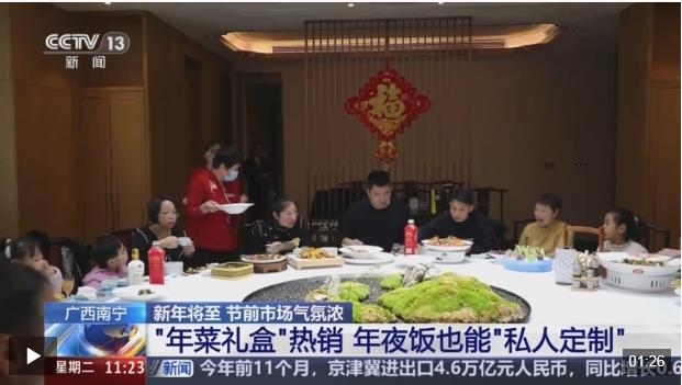 在廣西南寧,很多餐廳都開始了“年夜飯預訂”,并且在線上推出了“年菜禮盒”“年夜飯外賣大禮包”多款套餐,菜品特色主要以南寧本地菜為主,商家還能根據(jù)顧客的“私人定制”,對年夜飯?zhí)撞偷牟似愤M行調(diào)整。