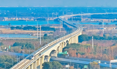 試運(yùn)行列車駛過滬蘇湖高鐵青浦特大橋金澤橋段。張海峰攝(人民視覺)