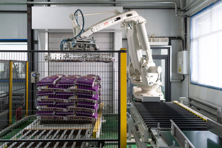 2024年3月29日,黑龍江省黑河市五大連池市一家農(nóng)業(yè)科技企業(yè)的機(jī)械臂在車(chē)間內(nèi)碼放包裝好的大豆種子。新華社記者 謝劍飛 攝