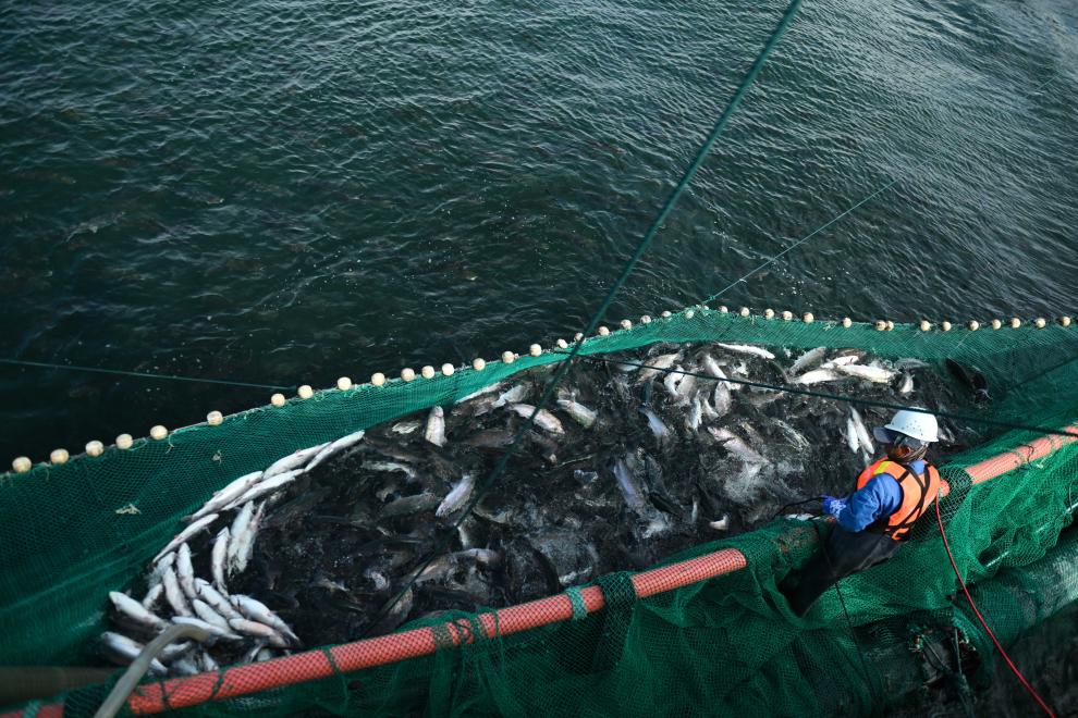 “傳統(tǒng)吊網(wǎng)捕撈會讓虹鱒魚體內(nèi)因緊張產(chǎn)生更多肌酸。我們現(xiàn)在用吸魚泵連魚帶水直接送入車間,保證魚肉質(zhì)鮮嫩?!彼f。