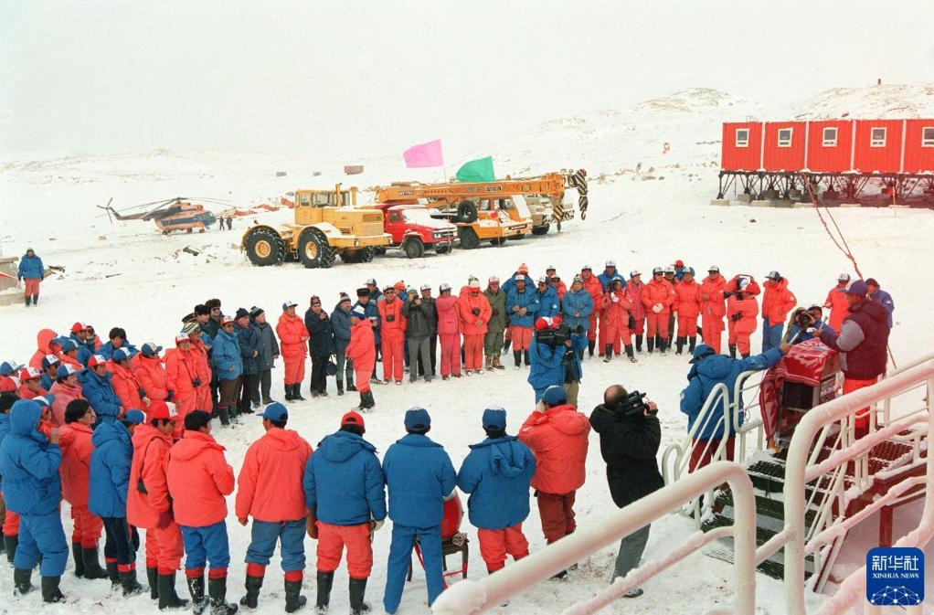 }1989年2月26日,中國南極考察隊員參加中山站落成典禮。新華社記者 張繼民 攝