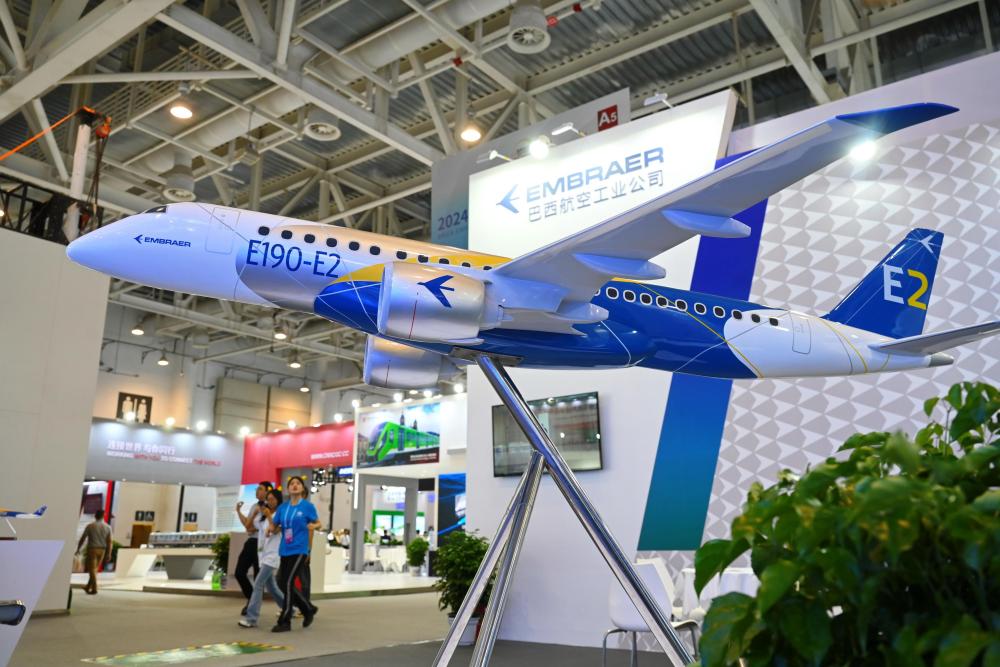 這是在廈門(mén)舉行的2024金磚國(guó)家新工業(yè)革命展巴西展位展出的E190-E2飛機(jī)模型(2024年9月10日攝)。新華社記者 林善傳 攝
