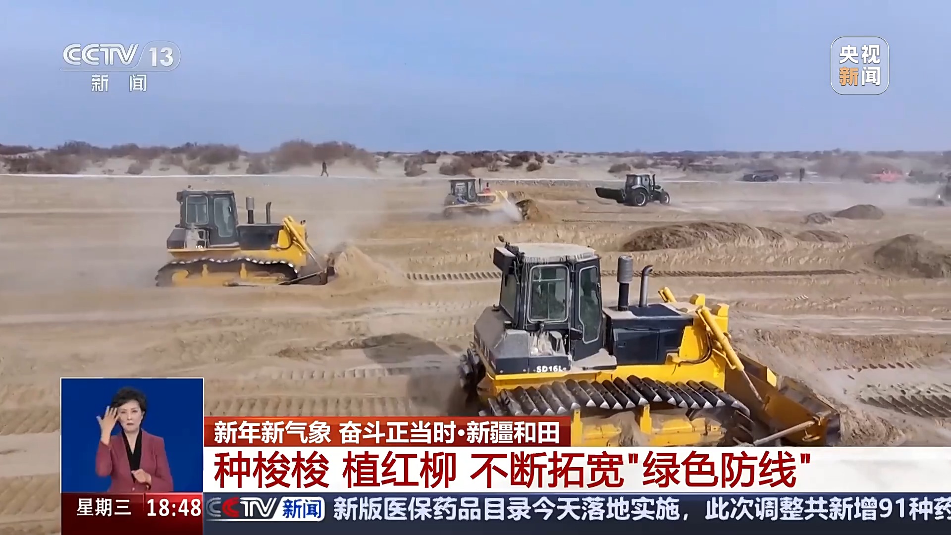 總臺記者 高鵬飛:這里是塔克拉瑪干沙漠南緣的和田于田縣,這兩天沙漠里面迎來了一場降雪,這會氣溫在零下10℃左右,非常寒冷,但是,在我旁邊就是一處熱火朝天的沙漠治沙現(xiàn)場。