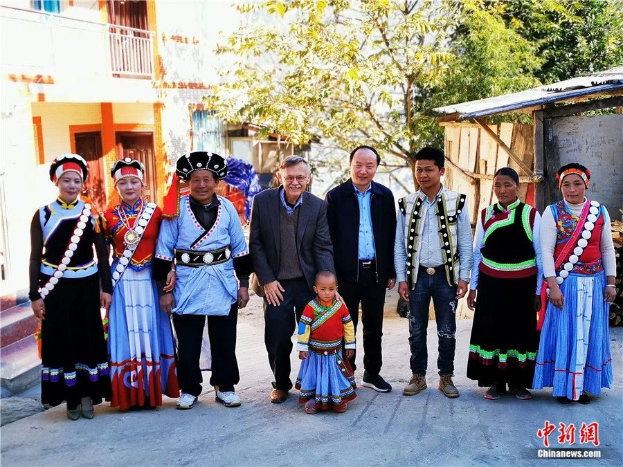 2019年第二次環(huán)游中國期間,潘維廉(左四)在云南與傈僳族居民在一起。受訪者供圖