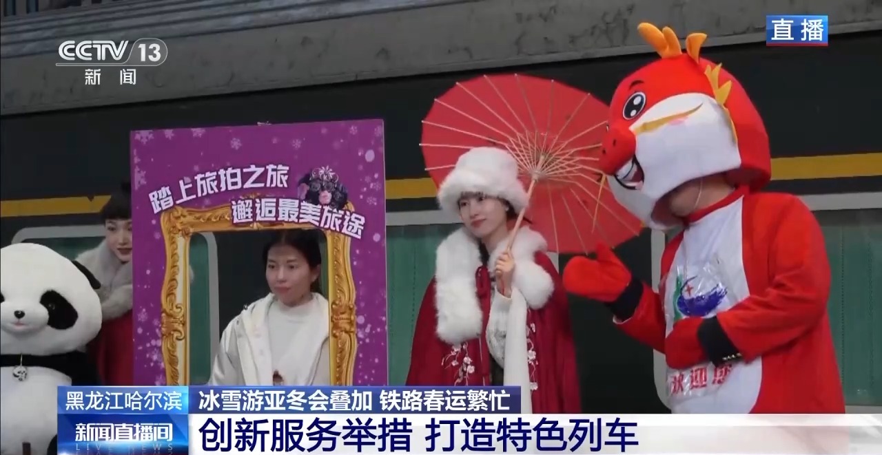 在春運(yùn)期間,鐵路部門還打造了特色主題列車,比如現(xiàn)在已經(jīng)開通的“旅拍列車”。車上設(shè)置了哈爾濱街景、民俗文化、冰雪奇遇等主題場景,車上還有化妝間、更衣室,可以為旅客提供多種風(fēng)格的旅拍服飾,旅客可以通過手機(jī)小程序進(jìn)行預(yù)約。拍攝人員也是由愛好攝影的鐵路職工組成的旅拍團(tuán)隊(duì),大家都是利用業(yè)余時(shí)間為旅客免費(fèi)提供服務(wù)。