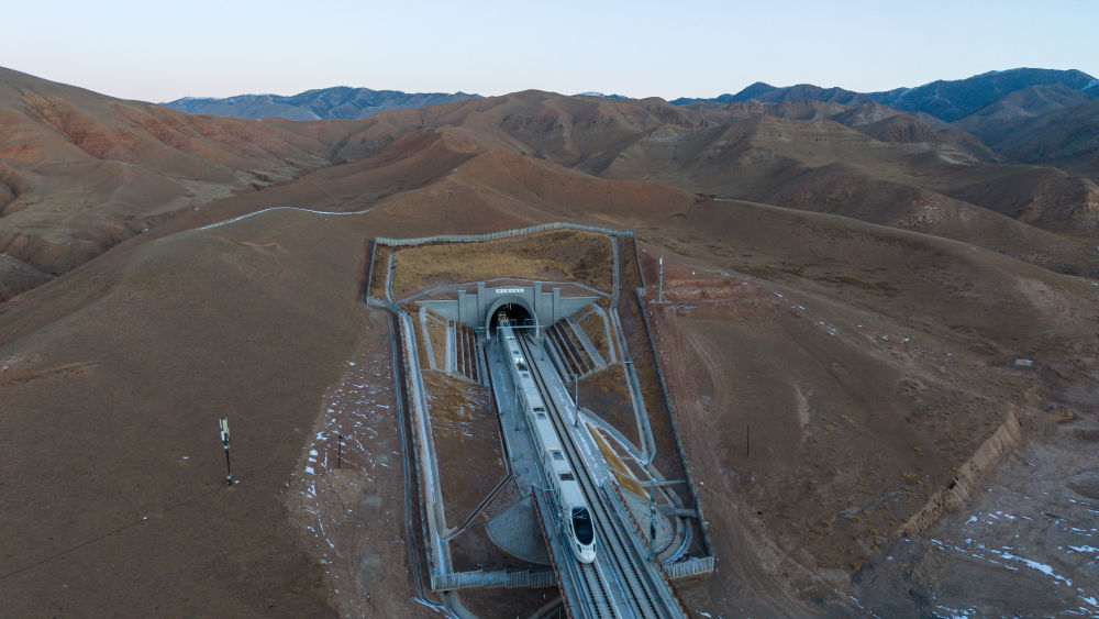 1月14日8時(shí)20分許,蘭州西發(fā)往武威東的D8885次動(dòng)車組列車穿過新烏鞘嶺隧道。這是新烏鞘嶺隧道通車后迎來的首列春運(yùn)列車(無人機(jī)照片)。新華社記者 郎兵兵 攝