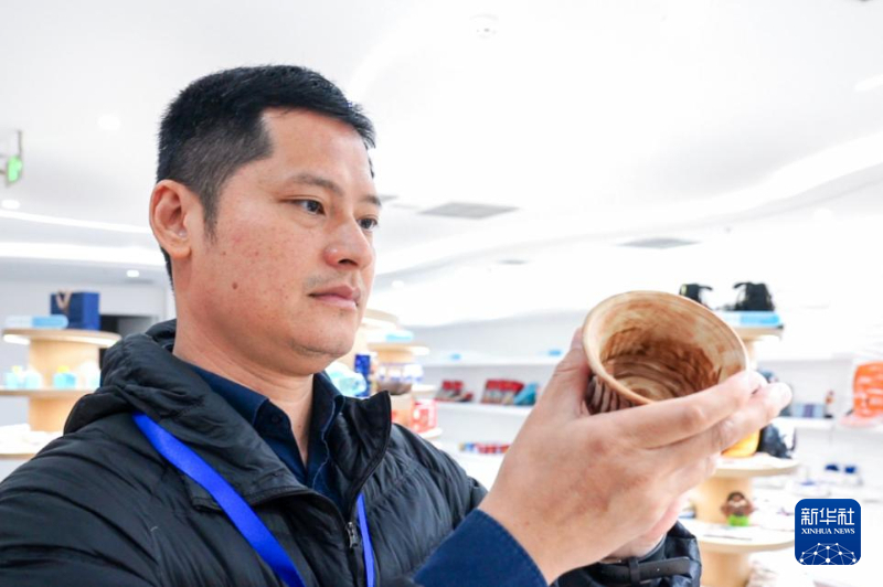 許桂榮在殼丘頭遺址博物館檢查館內(nèi)陳列的文創(chuàng)產(chǎn)品。新華網(wǎng) 肖和勇 攝