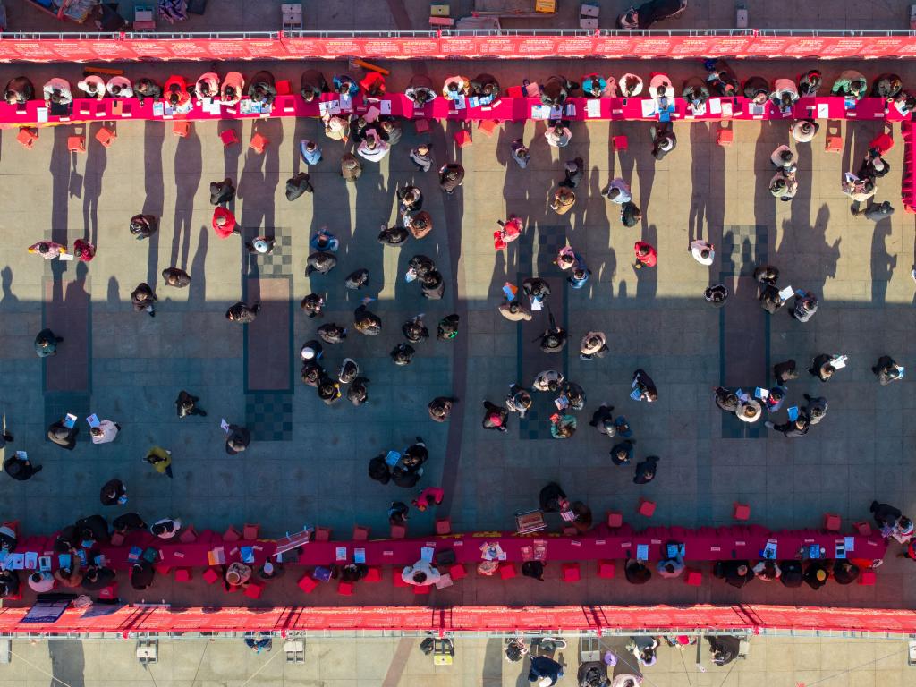 2025年1月15日,求職者在招聘會(huì)現(xiàn)場(chǎng)了解招聘信息(無人機(jī)照片)。新華社發(fā)(阮雪楓攝)