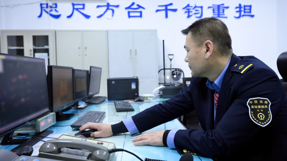 一間不大的值班室,除了床就是操作臺,“咫尺方臺 千鈞重擔”的條幅下,田春緊盯顯示屏。他負責運輸組織調度,是車站“最重要”的崗位。
