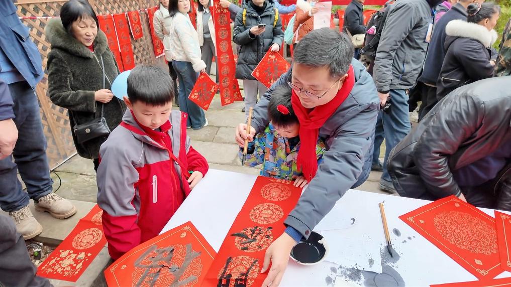 在當(dāng)日的非遺巡游環(huán)節(jié),鯉魚燈、舞龍舞獅、雜耍、川劇變臉吐火、塘河鎮(zhèn)婚俗嗩吶、狀元巡街、財(cái)神送福等精彩節(jié)目接連上演,吸引眾多游客駐足拍照;在非遺文化體驗(yàn)互動(dòng)區(qū),書法家們揮毫潑墨,將書法藝術(shù)、民俗文化融為一體,創(chuàng)作出一幅幅作品,游客們排起長(zhǎng)隊(duì),依次領(lǐng)取“新年祝?!薄?/p>