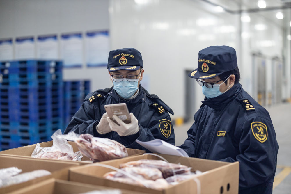 1月17日,在重慶國際物流樞紐園區(qū),重慶海關(guān)所屬渝州海關(guān)監(jiān)管科副科長劉議凡(左)與同事正仔細查驗通過中歐班列進口的牛肉。新華社記者 黃偉 攝